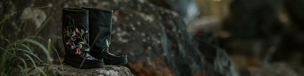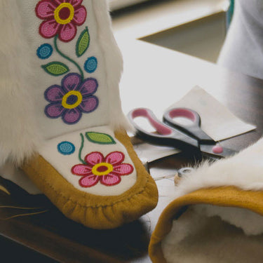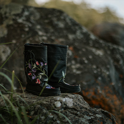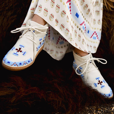 "I do have conversations daily with my ancestors and I believe that they share visions with me, and that's where a lot of inspiration comes from. For this pair with Manitobah I wanted embroidery because I knew I could get the highlights and the textures."